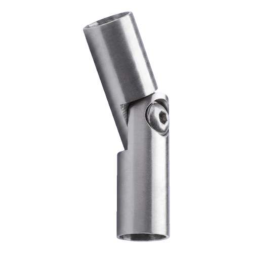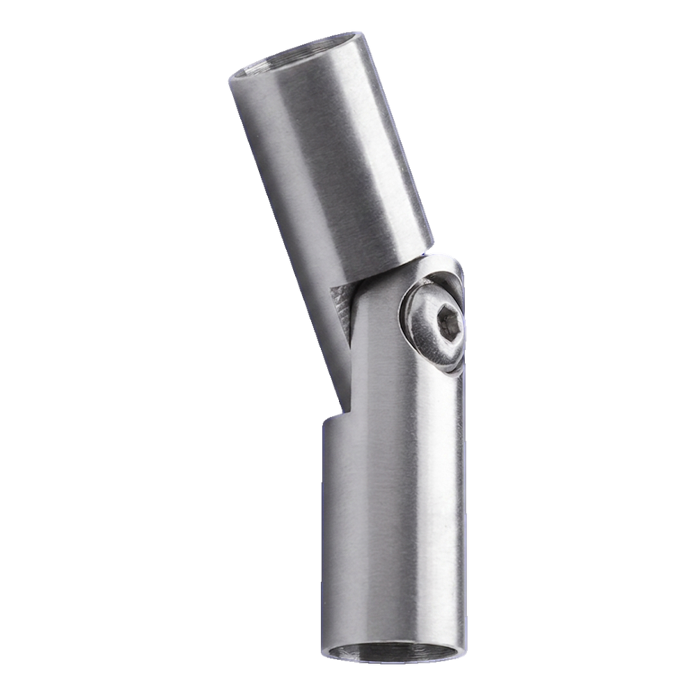 The connector is made from high-quality stainless steel AISI 304 with satin finish, which ensures high corrosion resistance and consistent appearance with other brushed steel balustrade elements. The angle setting is adjusted using an Allen screw, allowing for quick and secure installation without specialist tools.