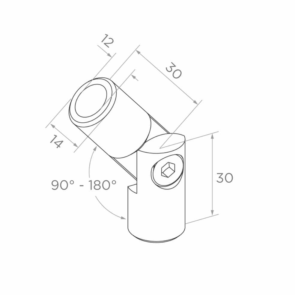 Adjustable elbow 90°–180° is a balustrade connector designed for durable and aesthetic connection of rods or handrails with diameter ø 12 mm. Thanks to the adjustable joint with range 90° to 180° it enables precise angle adjustment in corners of balcony, terrace and stair balustrades — without the need for cutting and welding elements on site.