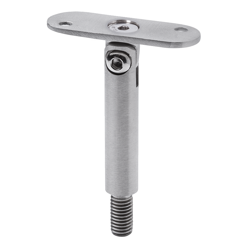 The adjustable rod is designed for installation in stainless steel balustrade systems — particularly in stair balustrades where a change in handrail angle is required. The joint allows smooth adjustment of the mounting plate inclination relative to the rod axis, so the handrail runs parallel to the stair line without the need for additional angled elements. It works well wherever the installer needs a flexible post-handrail connection: staircases, mezzanines, landings and galleries.