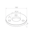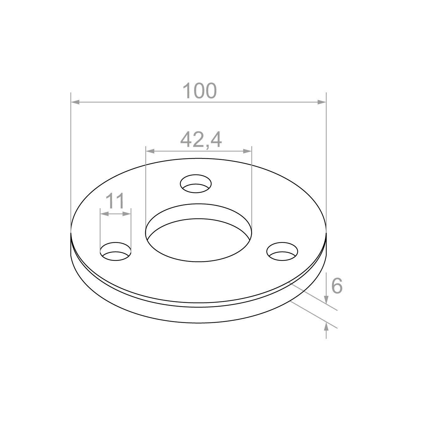 The base features three mounting holes with a diameter of 11 mm evenly distributed around the perimeter, enabling secure and symmetrical fastening. The central hole with a diameter of 42.4 mm is matched to the 42.4 mm system post tubes — the post is welded directly into the hole, creating a permanent and rigid connection.