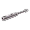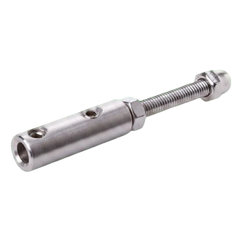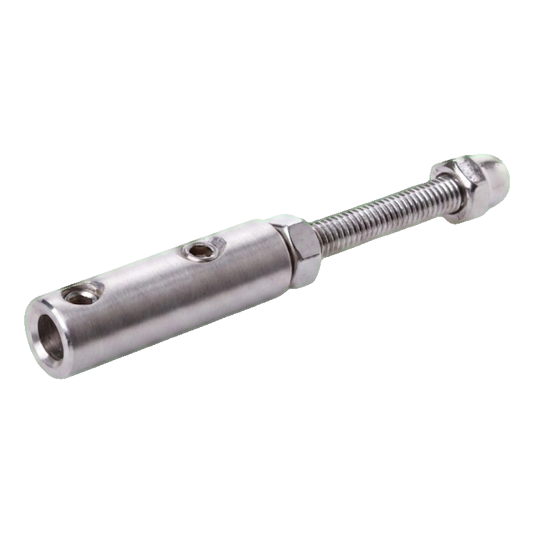 The clamp is designed for cable balustrade systems — it serves as a replacement for glass infills or other decorative elements. The cylindrical body with holes enables easy threading and locking of the cable, whilst the threaded stud with cap nut ensures aesthetic and stable mounting to flat surfaces. Stainless steel AISI 304 guarantees resistance to atmospheric conditions, making the clamp suitable for both indoor and outdoor use — on balconies, terraces and staircases.