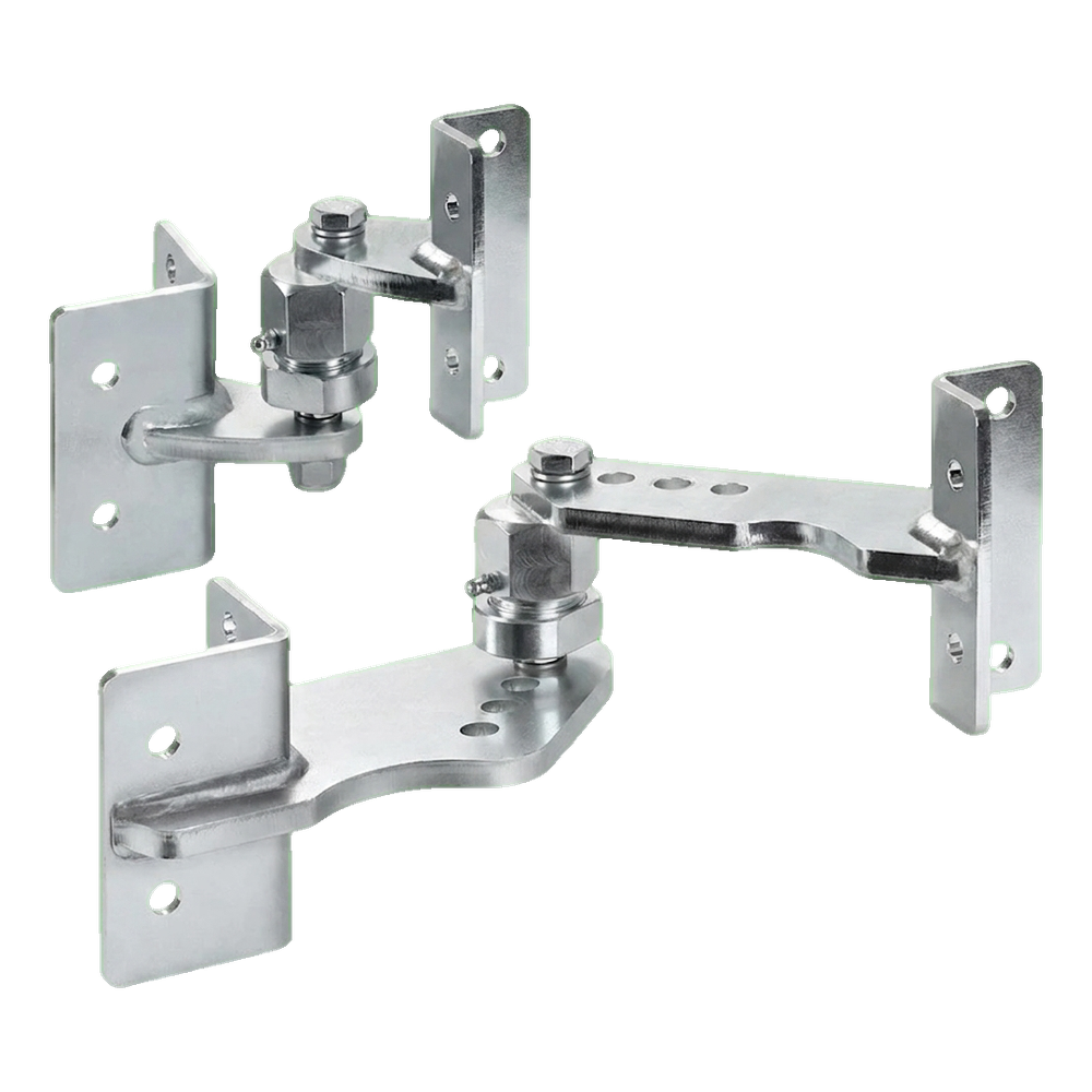The set is intended for professional installation of gates weighing up to 150 kg and maximum leaf length up to 3 metres, with terrain rise angle up to 10° (~20%). Thanks to joints equipped with grease nipples, maintenance is quick and convenient — without the need to dismantle the hinges.