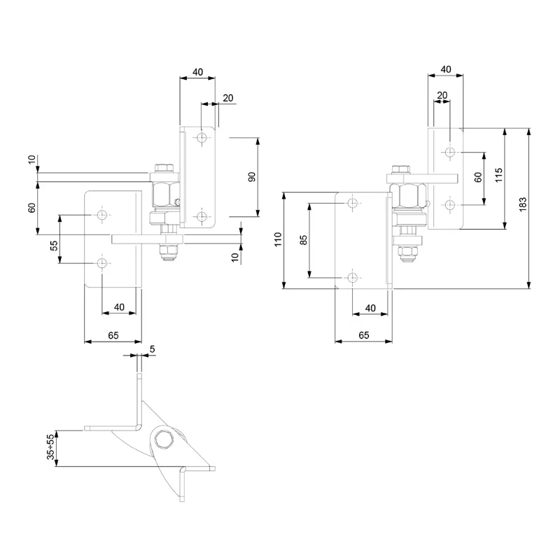 - Vertical hole spacing of lower plate: 85 mm (right view) / 55 mm (left view)