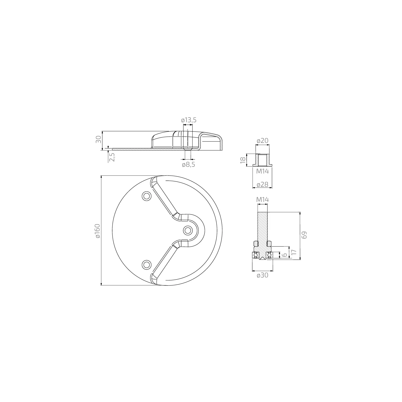 Kit includes: round buffer plate ø160 mm + mounting stud with M14 threaded sleeve.