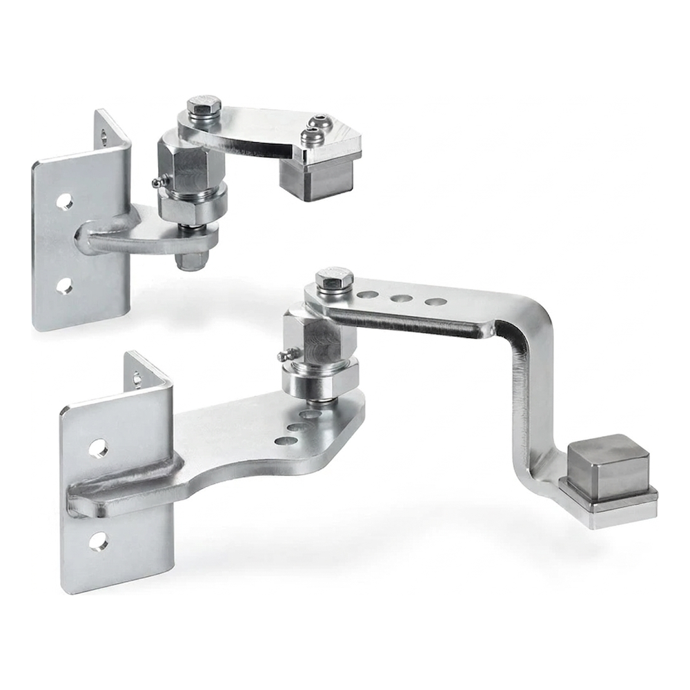 The set is designed for welded installation – brackets are mounted directly to the post, and the joint to the gate wing arm. Eccentric adjustment enables correction of wing positioning after installation, which significantly reduces installation time and eliminates the need for dismantling in case of minor adjustments. Grease nipples built into the joints ensure maintenance-free operation – periodic lubrication is sufficient without removing the hinges.