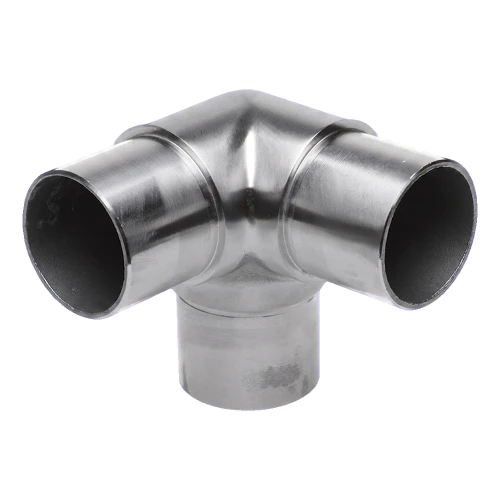 Corner T-connector designed for building balustrades with tubes of 42.4 mm diameter and 2 mm wall thickness. The element connects three tube sections converging at one point — two horizontal arms positioned at 90° angle and one vertical arm (post). This solution enables the creation of a balustrade corner whilst simultaneously connecting the handrail and post in one aesthetically pleasing structural node.