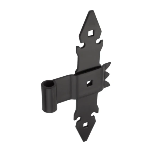 Decorative cross hinge in black is a decorative hardware element designed for mounting doors, gates and styled furniture. Thanks to its characteristic cross pattern with decorative spearhead finials, the hinge fits perfectly into rustic, retro and antique arrangements — enhancing the aesthetics of mounted elements.