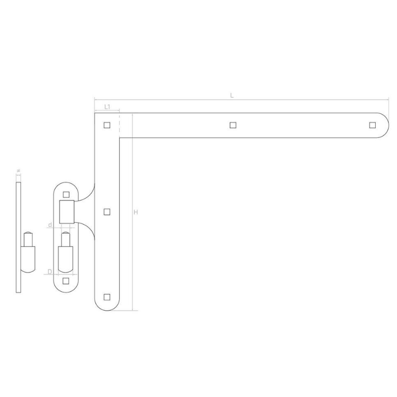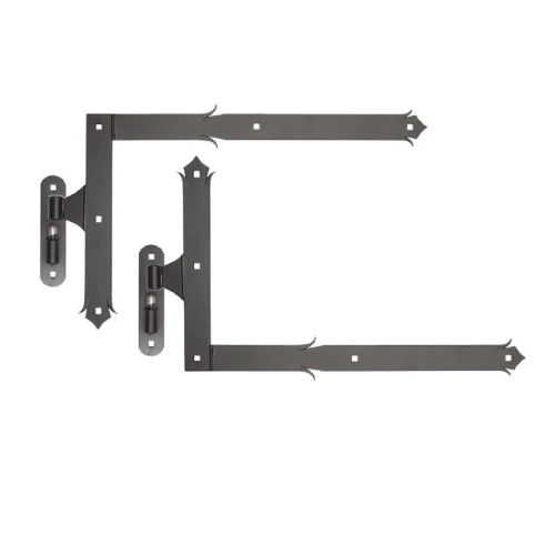 Complete set of decorative angle hinges with pin designed for mounting large doors, gates and entrance gates — particularly in farm buildings and facilities with traditional character. The set includes two hinges (upper and lower) for one leaf, allowing complete equipment of the mounting opening within a single order.