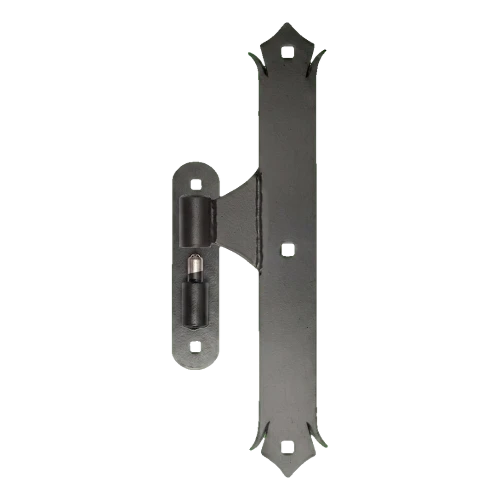 Decorative centre strap hinge with ball designed for mounting on leaf gates. Decorative plate endings in the form of stylised leaves give the gate an elegant, forged character, whilst the massive construction made from 5 mm flat bar ensures durability and reliability for years. The hinge is equipped with a rotating sleeve with pin, which guarantees smooth operation of the gate leaf.