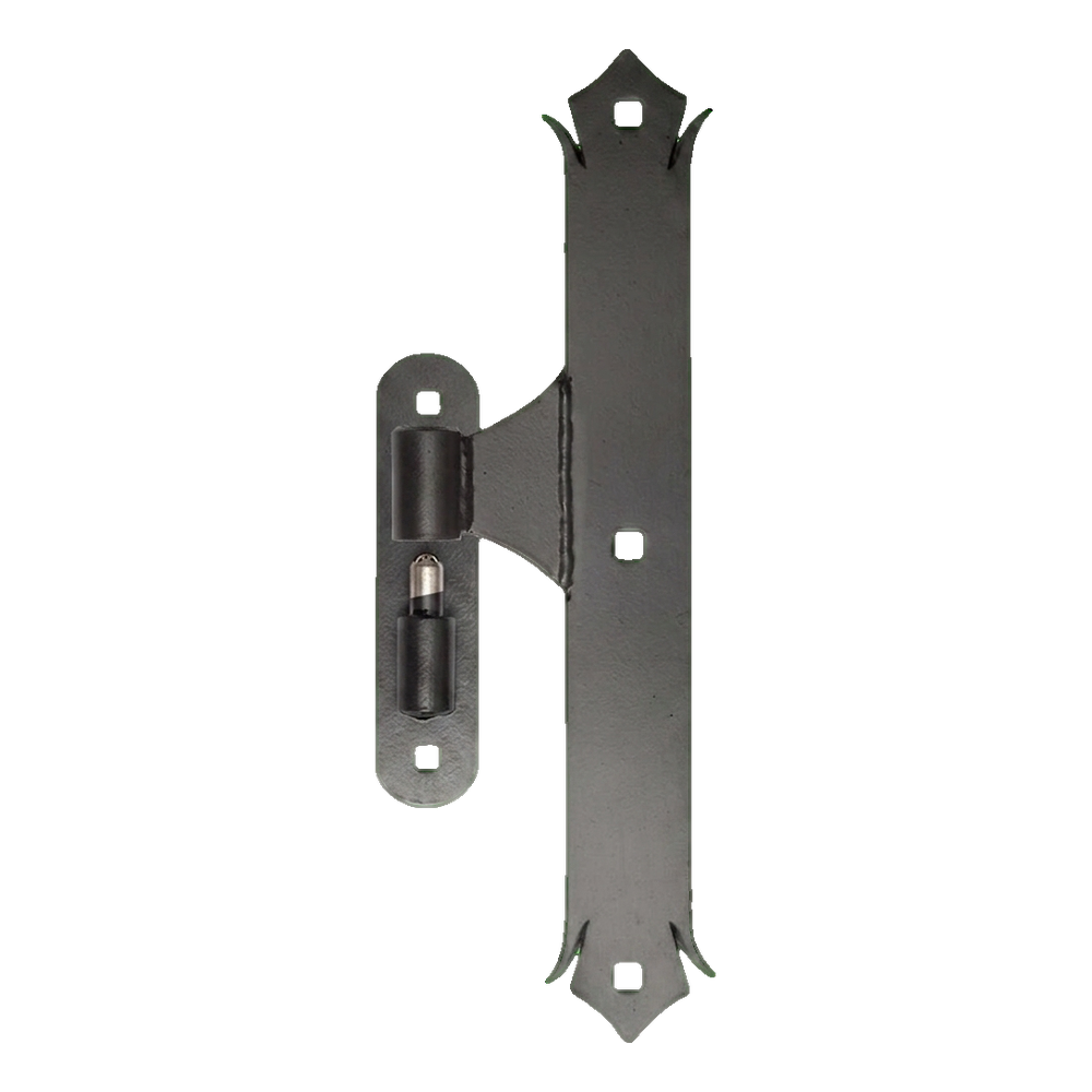 The hinge is designed for professional installation of leaf gates — both wooden and steel. The decorative form makes it ideal for gates with a traditional, rustic or wrought iron character. Thanks to its solid construction and weight of 1.64 kg, it provides stable support even for heavy gate leaves.
