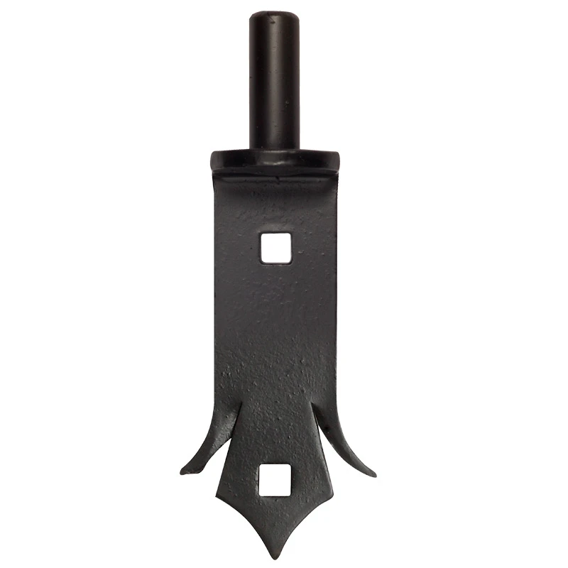 Decorative pin for belt hinge designed for swing gates and garden gate panels. Shaft with fi 14 mm diameter is mounted to the post by bolting - two square mounting holes ensure solid and durable fastening. Decorative profile of the mounting plate with characteristic spike gives the gate an aesthetic, wrought appearance.