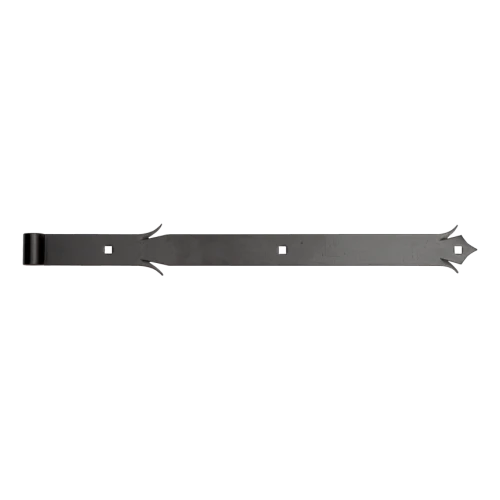 The decorative strap hinge is dedicated to swing gates in property fencing, farm entrances and buildings with traditional architecture. The decorative finish of the arm gives the gate an elegant, classic character. The product constitutes a ready hinge arm — for complete suspension of the gate leaf, a hinge pin (hook) is required, selected separately depending on the mounting method (screwed-in, driven-in or on a plate).