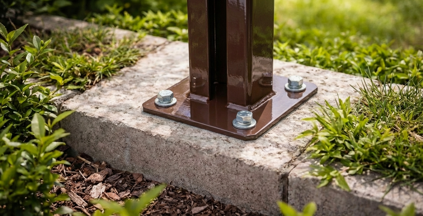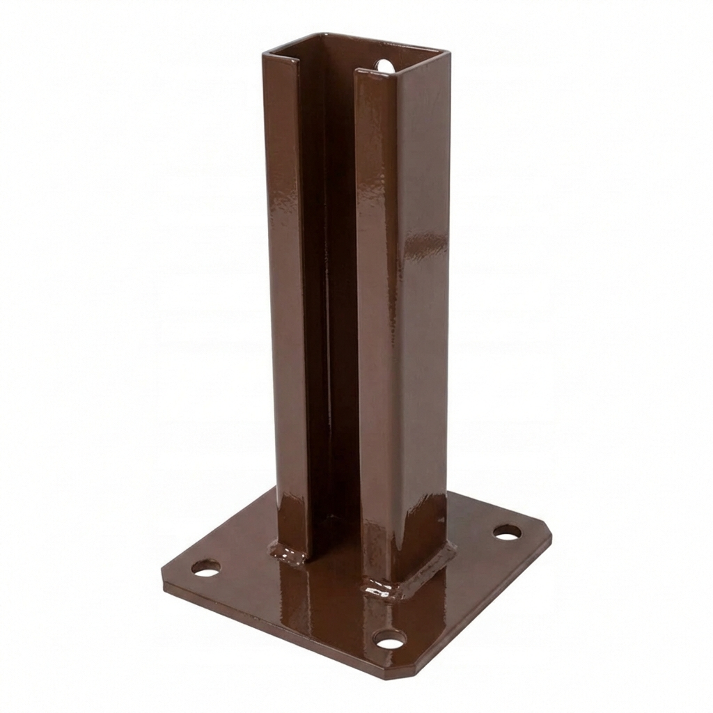 Fence post base 60×40 mm is a durable steel bracket designed for mounting panel posts on concrete surfaces. Thanks to galvanic zinc plating and powder coating in brown (RAL 8017), the product provides effective anti-corrosion protection and an aesthetic appearance — ideal for outdoor applications.