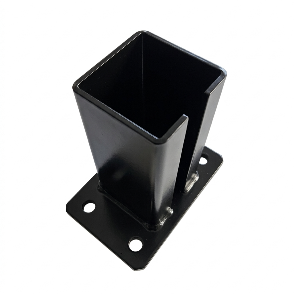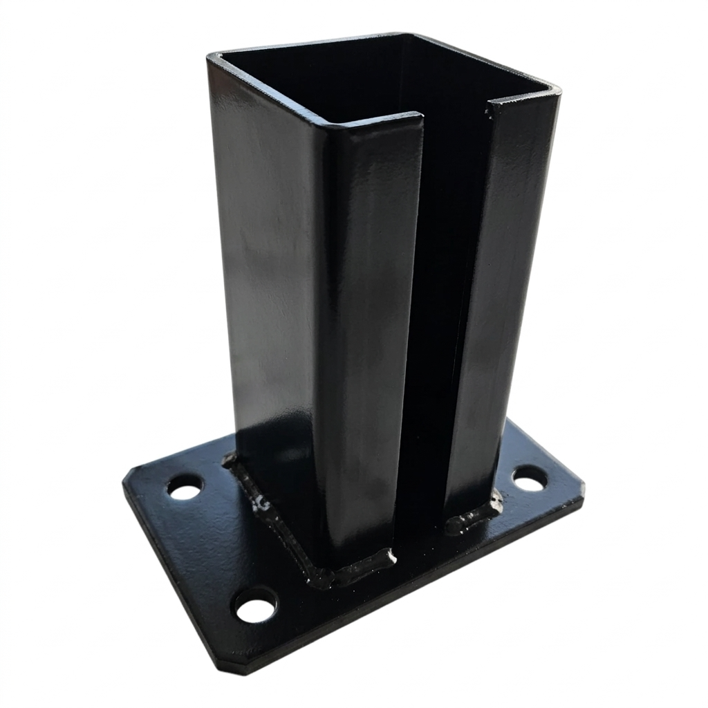 Steel base (foot) for gate and fence post 80×80 mm in black colour RAL 9005 is a durable mounting element enabling quick and secure fixing of profile posts to concrete surfaces, foundation walls and other hardened substrates. Thanks to the powder coating finish in colour RAL 9005, the product ensures an aesthetic, uniform appearance that perfectly complements modern panel fencing and gates in black shades — whilst providing effective anti-corrosion protection.