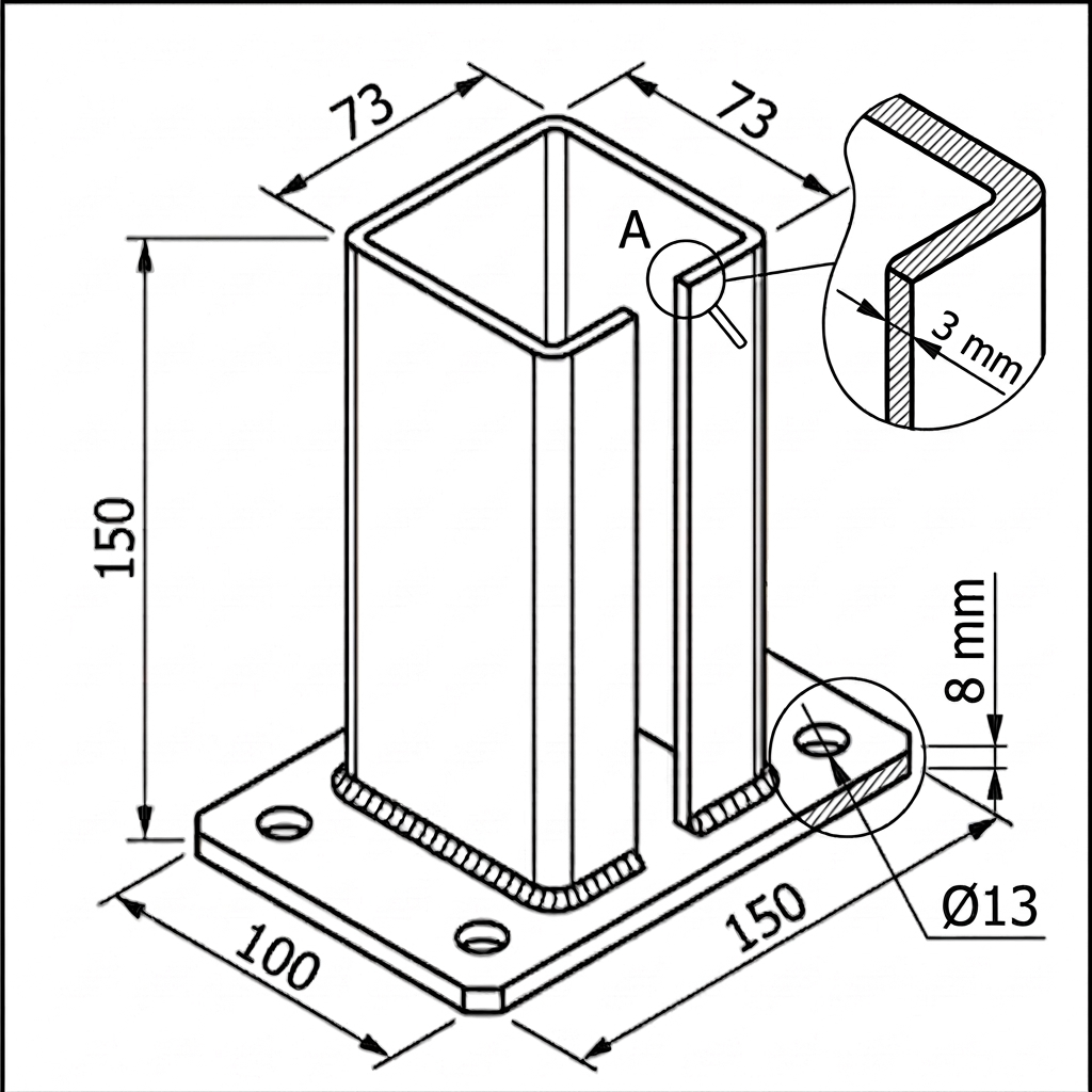 The construction consists of an open square profile 73×73 mm (adapted for 80×80 mm post) welded to a massive mounting plate with five holes for anchor bolts. The fillet weld at the base of the profile guarantees solid load transfer. The vertical gap in the profile allows for precise adjustment and compensation of post tolerances.