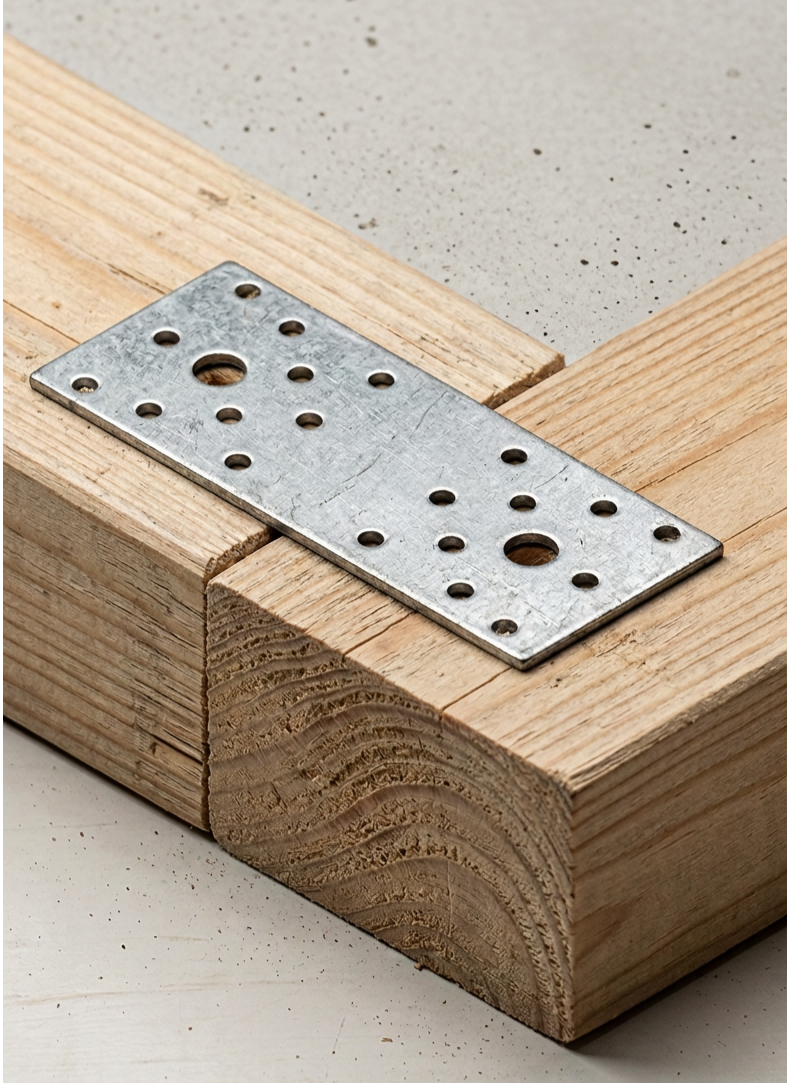 Flat connectors are used wherever joined timber elements must remain in the same plane — for example when extending beams, joining shuttering boards, assembling furniture components, or reinforcing timber joints. The wide range of holes allows flexible fastening using various types of mechanical fixings.