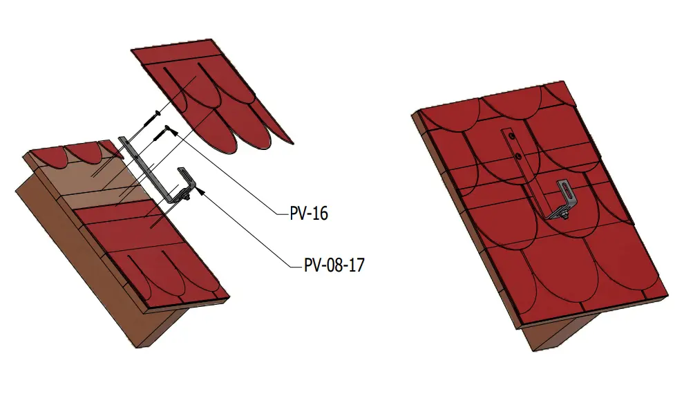 Roof bracket for mounting PV panel rails to slate-covered tiles and bituminous shingles. No adjustment available - requires a flat roof surface. For uneven roofs, choose hooks with single adjustment.
