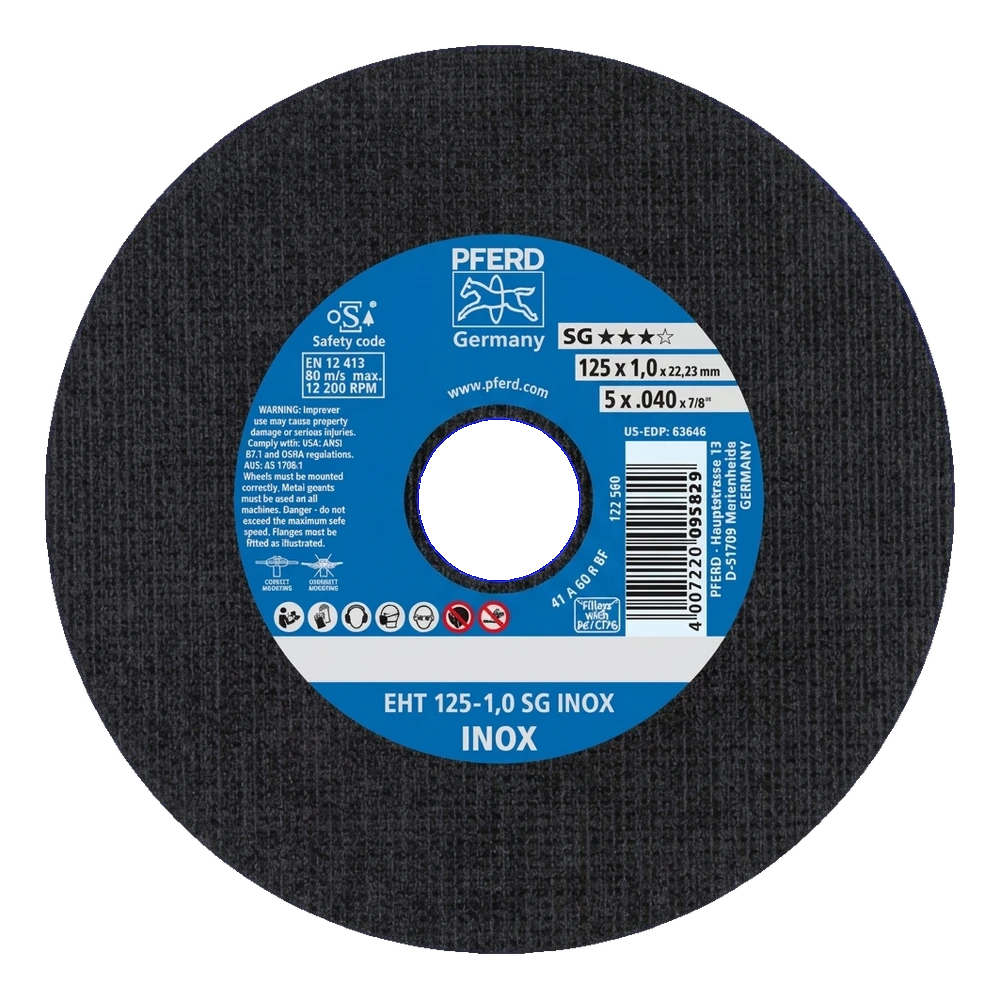 PFERD EHT 125-1,0 SG INOX is a high-performance type 41 (straight) cutting disc designed for precise cutting of steel and stainless steel (INOX). With a thickness of just 1,0 mm, the disc ensures a narrow kerf, minimal material loss and cool cutting — which is particularly important when machining temperature-sensitive stainless steel components. The German brand PFERD guarantees repeatable quality and safety confirmed by EN 12413 certification and the oSa safety mark.