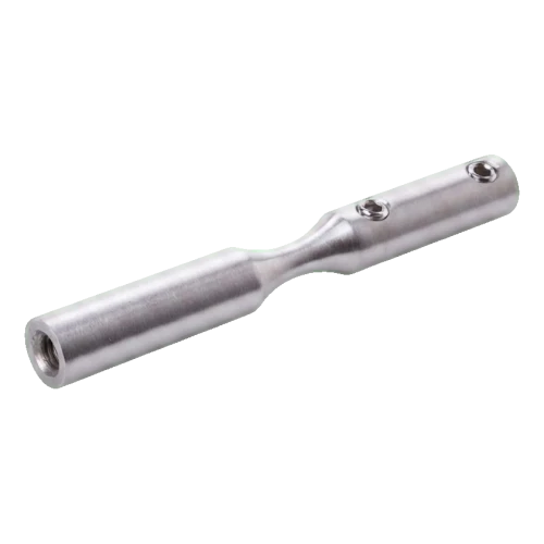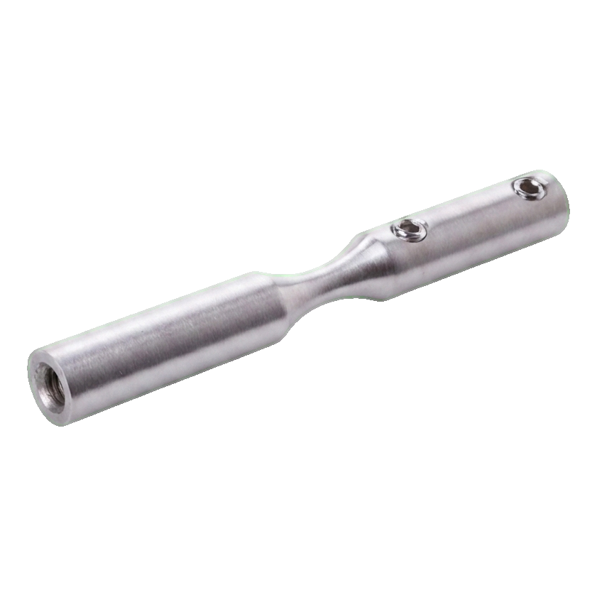 The element is made from stainless steel AISI 304 with satin finish ensuring high corrosion resistance and an aesthetic, understated appearance. Installation is carried out by screwing in — the bracket is equipped with M6 threads and locking holes (Ø6 mm), which guarantees stable and durable connection with the cable and load-bearing structure.