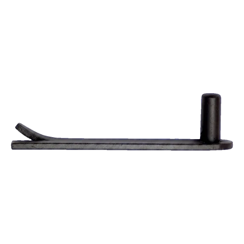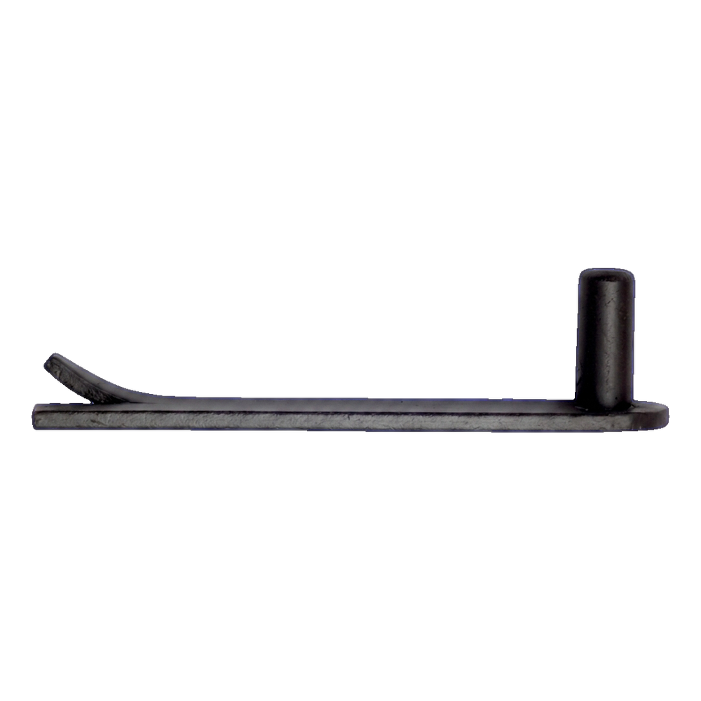 The pin is installed by embedding the flat base with tongue into the gate post — the element should be set in mortar or cast in concrete so that only the cylindrical spindle protrudes outside. The tongue (bent end of the base) prevents rotation of the pin in the wall and increases anchoring strength. After the mortar has hardened, the strap hinge arm is placed onto the spindle, creating a complete pivot point for the gate leaf.