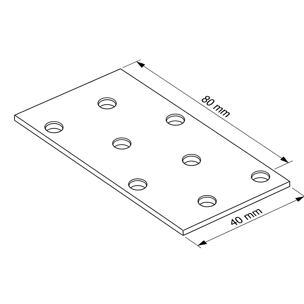 The flat connector 40×80 mm is a versatile perforated plate designed for structural connections where the lateral surfaces of the joined elements lie in the same plane. Thanks to 8 holes distributed symmetrically across the plate, this element enables both simple and more complex connections — particularly when assembling roof trusses and timber structures.