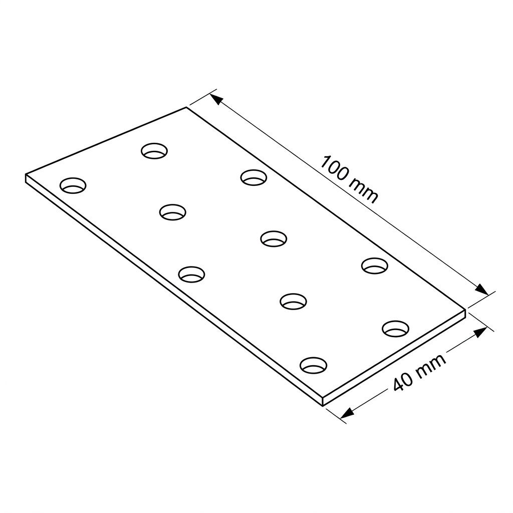 The universal perforation pattern with evenly distributed holes allows the plate to be used in many joint configurations — both symmetrical and offset. The compact 40×100 mm format with a thickness of 2.0 mm makes the connector strong enough for typical carpentry applications, while remaining easy to store and transport even in large quantities.