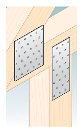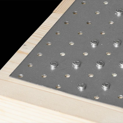 Perforated plates are most commonly used in roof truss assembly, where they provide a durable and stable connection between rafter members, posts and struts. They are equally well suited wherever a fast, repeatable installation of flat connectors is required — from roof structures to pergolas, carports and outbuildings. Fixing is carried out using ring shank nails with a diameter of ø4 mm, which ensure secure embedment in timber and full utilisation of the connector's declared load capacity.