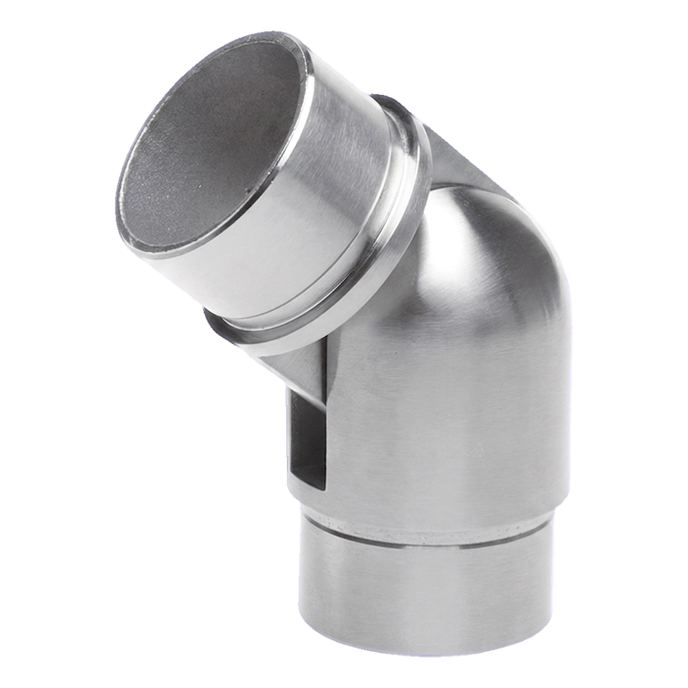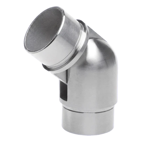 Articulated elbow for balustrade tube with diameter 42.4 mm and wall thickness 2 mm, with angle adjustment in the range 90°–180°. Connector designed for building stainless steel balustrades — enables smooth direction change of handrails on stairs, ramps and landings, eliminating the need to use multiple variants of fixed-angle elbows.