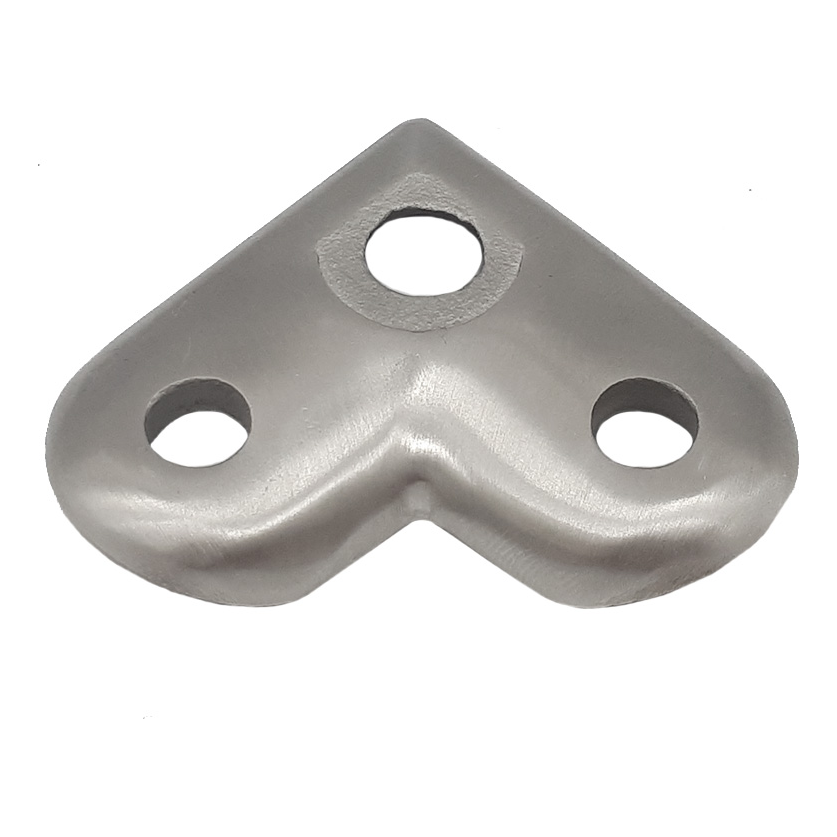 The plate is designed for mounting handrail brackets at corners — where the balustrade run changes direction. Installation is carried out by screwing the plate from above to a flat surface (e.g. post or support column). Three mounting holes ensure secure, three-point fixing and eliminate the risk of element rotation under load.