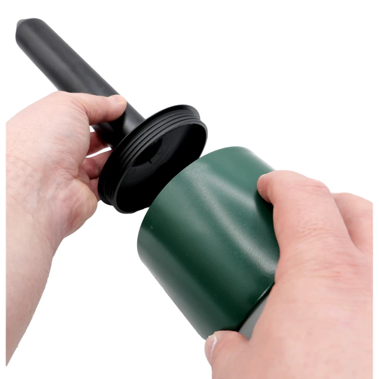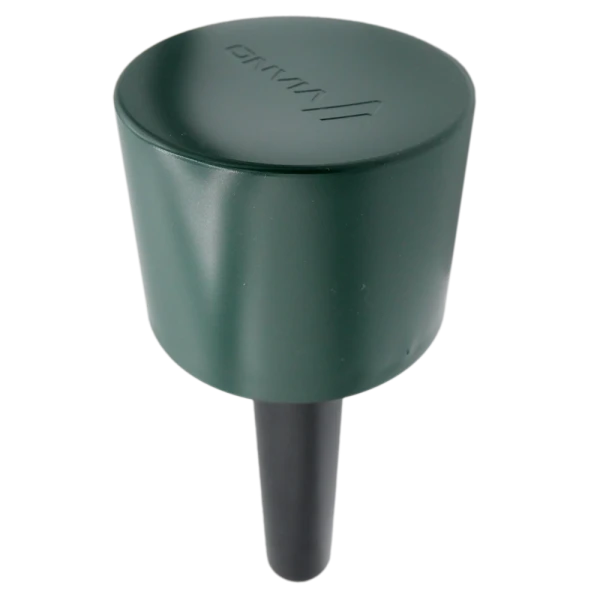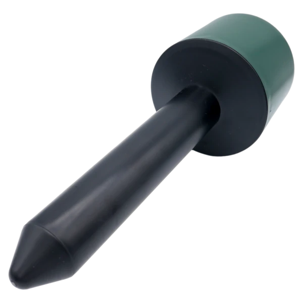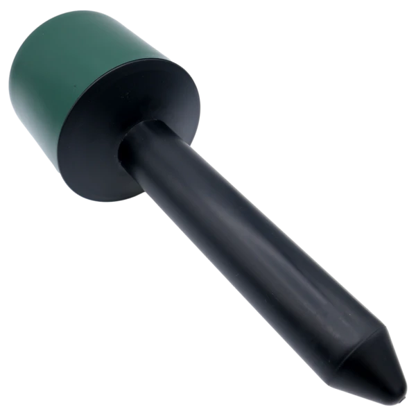 Simple installation in a few steps. Simply unscrew the head unit, switch on the device using the POWER switch, screw the head unit back on, then carefully screw the spike into the ground. For first-time installation, it is recommended to make a vertical hole in the molehill using a stick or rod. Once installed, the head unit should protrude approximately 5 cm above ground level. The device operates continuously until switched off or the battery is depleted.