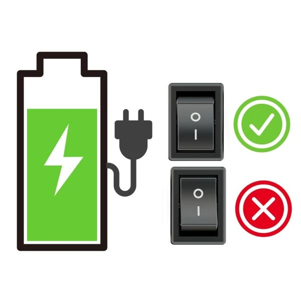 Battery level monitoring is equally straightforward. The LED indicator signals battery status: a 1-second flash every 10 seconds indicates approximately 30% charge, whilst a short flash (~100 ms) every 5 seconds indicates below 10%. When the charger is connected, the LED remains continuously lit, and switches off when charging is complete. Note: charging only occurs when the switch is in the on position ("I").