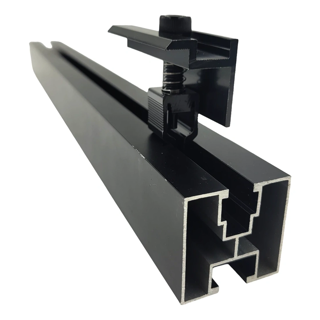 The clamp is made from 6060 aluminium with a black powder coating, providing excellent corrosion resistance and an aesthetic finish that complements dark PV modules. The black finish is an increasingly popular choice among installers who want a uniform appearance across the entire installation.