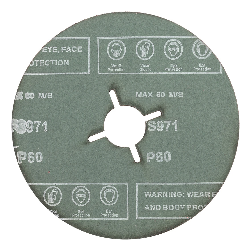 When working with fibre discs, full personal protective equipment must be used: eye, face, hearing, hand protection (gloves) and protective clothing — in accordance with markings on the reverse of the disc.