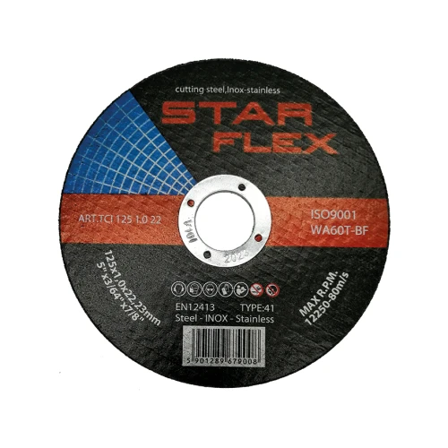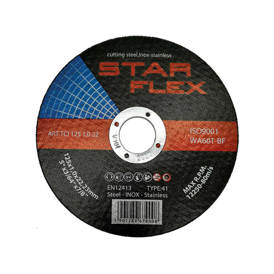 Star Flex cutting disc 125×1.0 mm is a thin, flat grinding wheel type 41, designed for precision cutting of mild steel, stainless steel and acid-resistant steel. With a thickness of just 1.0 mm, it ensures fast, burr-free cuts with minimal material loss — the ideal solution for installation teams working with steel profiles, pipes and metal structures on construction sites.