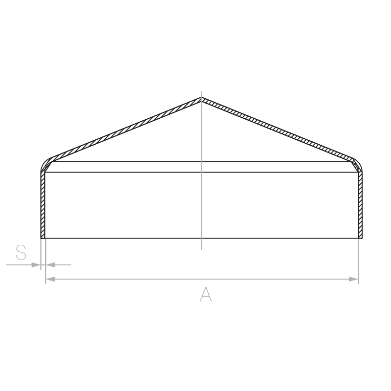 In the technical drawing, dimension A denotes the internal width of the cap (fitted to 100 × 100 mm post), and dimension S — the steel sheet thickness of 1 mm. The high rim construction guarantees secure fitting on the post and effective rainwater drainage.