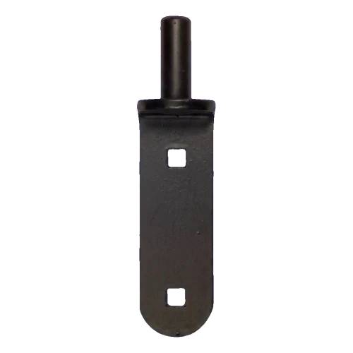 The pin is made from black steel, which ensures high mechanical resistance and aesthetic appearance that harmonises with fencing and gates in dark colours. The angular profile allows flat mounting to the post — the pin projects perpendicularly, creating a rotation axis for the strap hinge. Two square mounting holes allow for quick and secure bolting of the element, which significantly speeds up installation work on site.