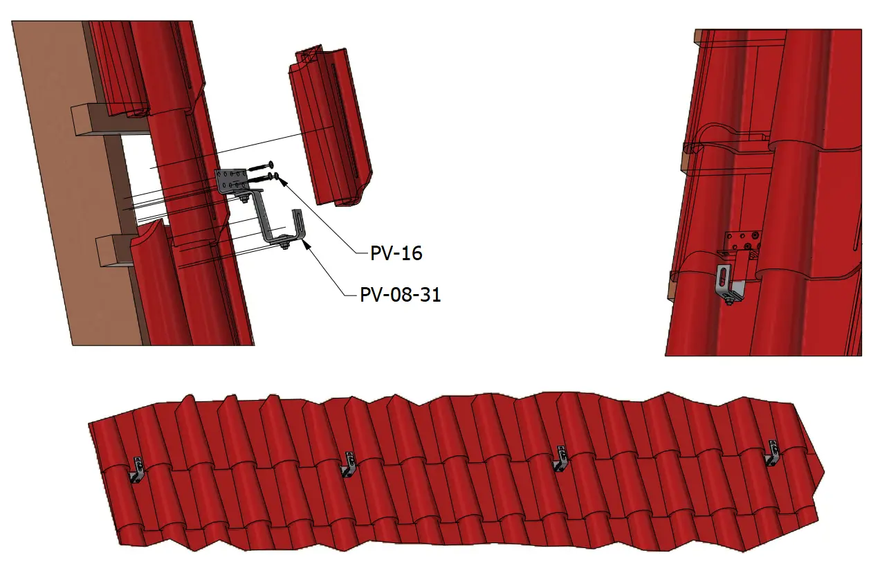 Vario Roof Hooks for mounting rails for photovoltaic modules on roofs covered with ceramic and concrete tiles. Guarantees stability of the entire structure.